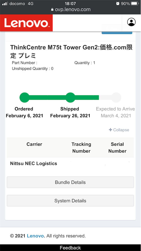 2021-03-02 久々にデスクトップパソコンを買いました その25 パソコン Lenovo ThinkCentre M75t Tower Gen2 今日の進捗。 少しだけ進んでいます。 日通NECロジスティクスの追跡サイトでも少しだけ進んでいて、今日配送センターから出荷されたことになっていました。 ここから先はヤマト運輸での配送となるようですので、明日には到着しそう…と思いましたが、到着日を指定されているようで、明日の受取はできそうにありません。。 ちょっと残念(>_<)