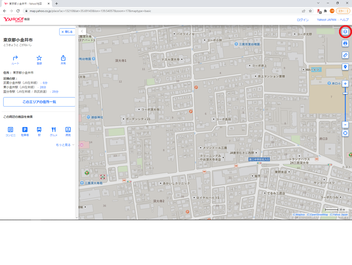 まずは所在地と保管場所が入るように地図を表示し、右上の菱餅のようなアイコンをクリック。