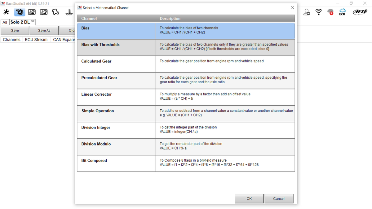 Add Channelを押してみると、どうやら取得できた値が計算してギアポジションを表示してみたりとかできるようです。
